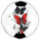 Bando de borboletas voadoras, realistas, vermelhas e pretas em fundo branco com gotas de tinta.