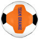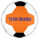 Bola de futebol com peças em azul escuro e laranja com design de texto personalizado "Team Orange". Fácil personalizá-lo agora com o nome do seu próprio grupo / o logotipo da sua cidade/clube etc. Design por Alma Wad.