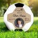 Parabéns Russos Formando Futebol de Graduação Preta. Bola de futebol personalizada com boné de formatura, texto personalizado e uma fotografia num quadro redondo sobre um fundo bege rústico. Um presente de excelente e uma bola de futebol para um formando que adora esportes.