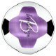 Essa bola personalizada de futebol apresenta um monograma e primeiro nome em um moderno roteiro preto e branco sobre um fundo roxo de metal escovado.