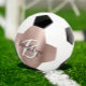 Esta bola personalizada de futebol apresenta um monograma e primeiro nome em um moderno roteiro preto e branco sobre um fundo de metal escovado dourado rosa de vidro.