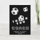 Bola de Futebol Moderna Preta e Branca Obrigado Cartaz do Treinador. O cartão tem três bolas de futebol preto e branco sobre fundo preto. Cartão de excelente para agradecer aos treinadores desportivos, aos treinadores da equipe de segundo grau, à mãe ou ao técnico de pais, etc. Personalize qualquer texto no cartão. Adicione o nome do treinador, o nome da equipe e o ano.