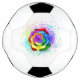 Rosa grande e florescente com pétalas arco-íris sobre fundo branco, pintadas com pedaços de tinta colorida e brilhante. 3d
