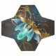 Barbeiro véu com asas transparentes azuis e lâmpada verde sobre fundo vestido, marrom, texturizado. Estilo Steampunk.