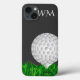Imagem da bola de golfe, grama verde e modelo de monograma personalizado.
