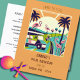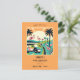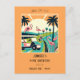 Um convite de aniversário ousado e colorido estilo art-deco-50º em laranja vibrante, verde e creme com flamingos cor-de-rosa, carrinho de golfe e palmeiras. Use este cartão-postal para celebrar o aniversário de 50 anos do seu amigo, da sua esposa, do colega de trabalho, parceiro, etc. com um jogo de golfe seguido de bebidas celebratórias e janto. Esperemos que a garota de aniversário consiga marcar um buraco em um!