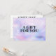 Elevem sua experiência de doação com nossos certificados de presente personalizáveis. Criados sobre um fundo holográfico falso e adorados com texto negro e ousado que diz 'A Gift For You', estes certificados servem como uma canvas para o seu toque pessoal. Personalize a frente com sua própria mensagem sincera, fazer cada certificado de presente como um gesto verdadeiramente monótono. Mas não pára por aí. Sacudir-o e encontrará uma apresentação elegante e profissional. Seu nome ou nome comercial é mostrado elegantemente em uma fonte preta e ousada, definindo a palco para um momento memorável de dar presentes. Abaixo, você encontrará campos convenientes para 'Para', 'De' e 'Quantia', garantindo um toque completo e profissional para seu presente pensado. Dê o dom da escolha e faça todas as ocasiões especiais com nossos certificados de presentes personalizáveis. Perfeito para butiques, lojas online, salões de beleza, salões de unhas, cabeleireiros e muito mais! Comece a personalizar o seu hoje! Design Studio design por 1201AM | www.1201am.com