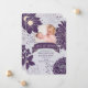 Flores coloridas de ameixa velhas borrifadas com pequenos pontos em um fundo de lavanda macia criam um anúncio de nascimento moderno para uma menina com sua foto e seu nome.