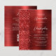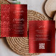 A borda esquerda deste elegante convite de casamento moderno apresenta uma borda falsa vermelha. O texto personalizável combina manuscrito branco, fontes em copperplate e itálico em um fundo vermelho de metal escovado. O verso fornece espaço para detalhes do casamento em um fundo de metal escovado vermelho, junto com um código QR que os convidados podem digitalizar para visitar seu site e RSVP, o que economiza o custo de impressão e envio de placas RSVP separadas.