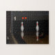 Uma foto de uma bola de boliche rolando em direção a dois pinos sentados em uma formação dividida.