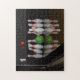 Uma quebra-cabeça de quebra-cabeça composta por uma imagem de uma bola de boliche que se desprende nos pinos. Como um sacudir no ar, os outros estão no palco inicial de girar.