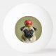 Engraçado Pug com uma maçã balançando em cima de sua cabeça.