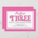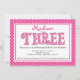 Comece sua festa de aniversário de 3 anos com nosso adorável convite de festa de aniversario de meninas do alfabeto rosa bolinhas. Nosso convite de aniversário de meninas fofo apresenta a palavra "três" em um padrão de bolinhas rosa e branco quente, definido em um fundo branco com um quadro de borda pontilhado cor-de-rosa e branco.