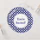 Um modelo de aniversário, noiva ou chá de fraldas com pontos de polca brancos grandes e pequenos sobre fundo azul escuro em um convite redondo. Personalize-o para alterar fontes, cores de fundo e muito mais, até salve seu design para mais tarde.