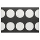 O tecido Na moda apresenta um padrão geométrico em negrito de grandes bolinhas brancas sobre um fundo preto.