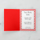 Um convite de festas dobrado personalizado com itálico e letras em bloco em pontos polka brancos em um fundo vermelho. Ou personalize esta design para alterar fontes, dimensionar, adicionar ou remover texto e muito mais.