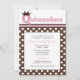 Quinceañera, bolada e na moda, com bolinhas brancas sobre castanho em ambos os lados, e uma coroa sobre o cor-de-rosa "Q" em "Quinceañera".