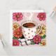 Baquetas brancas, com uma caneca de café bolinhas, cubos de açúcar e flores rosa e amarelas.
