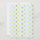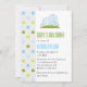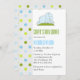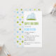 Convite do chá de fraldas do casal à moda feito no branco, com uma banda de bolinhas verdes e azuis, no lado esquerdo e em um elefante azul bonito, na parte superior do convite. Personalize todo o texto para serir suas necessidades do evento.