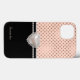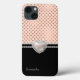 Capas de iphone gráfica, com gráficos de bolinhas de tons de ouro rosa em um fundo embutido, na metade superior do gabinete, com uma parte inferior preta sólida. Gráficos de duas cordas de pérolas correm no meio do gabinete, com uma joia de pérolas em forma de coração, na parte central da frente. Personalize o nome para si mesmo ou como uma bela ideia de presente para ela.
