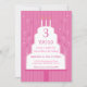Um convite cor-de-rosa com balões e um bolo branco com velas iluminadas. O texto mostra dentro espaço do bolo para um convite divertido e informativo. O plano de fundo na frente da placa tem um padrão de listras rosa.