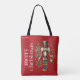 Tema de Natal Nutcracker com ornamento, tipografia branca de Feliz Natal e texto personalizável sobre fundo vermelho.