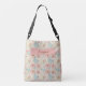 A floral applique patchwork pattern with pink and ivory flowers roughly stitched onto blue and ivory fabric, with worn, ecru lace gives this crossbody bag a shabby and chic look that you will love. Resembles and old quilt, forgotten in an attic. Very feminine, perfect for anyone who loves stitching.