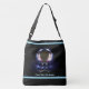 Uma imagem fractal azul e roxa que se assemelha ao capacete e ombros de um astronauta em um fundo estrelado. Adicione seu próprio texto.