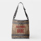 Legal bolsa de corpo cruzado para aqueles que vivem no campo a vida mostra "Backwoods Babe" angustiado texto vermelho escuro com rico florescendo sobre um fundo de madeira de whiskey keg.