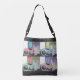 O design colorido neste corpo cruzado Tote Bag foi feito de uma fotografia original de ZoeSPEAK de uma bicicleta estacionada fora de um compro em Key West, na Flórida. Vestuário do compro pendura na porta aberta atrás da bicicleta. A foto é feita em quatro esquemas de cor, bicicleta vermelha, bicicleta azul, bicicleta verde e amarela, com cores de roupa correspondentes. Os fundos estão em tonalidades mudas de massa e cinza-azeitona, e o fundo geral é um preto marmoreado.
