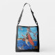 Esta mala de cruzamentos de impressão corpo inteiro tem uma bruxa engraçada em um maiô preto e capa vestida para a praia voando sobre o oceano em uma vassoura com seu gato preto e cercada por gaivotas na frente e atrás.