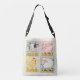 Esta mala de tote divertida apresenta um quarteto de animais de fazenda clássicos — uma vaca, um porco, uma galinha e uma ovelha — cada um se posiciona contra um fundo de gingham colorido e texturizado.