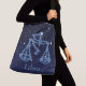 Saco de impressão com o símbolo da Libra em azul-prata suave, sobreposto com as estrelas da constelação, contra um fundo de céu estrelado formando de azul-da-meia-noite a preto.