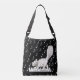 Isto por toda a mala de cruz de corpo impressão tem um gato branco feliz com uma cauda grande e fofa a piscar enquanto ele dança através das teclas de piano sobre um fundo preto com notas de música branca.