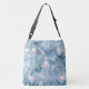 Este design de sacola de corpos cruzados apresenta um padrão maravilhoso de flamingos cercados por folhagem tropical abundante e orquídeas em azul empoeirado e rosa-claro-claro. Foi fornecido um rótulo para guardar o seu nome e monograma ou outro texto. Procure ID868 para ver outros produtos com este padrão tropical legal.