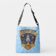 Esta bolsa de mão personalizada para crianças apresenta um emblema ousado e vibrante de explorador espacial. No centro do emblema está um foguete de desenho animado divertido voando pelo espaço com planetas orbitando ao seu redor.