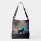 O lobo galáctico apresenta uma silhueta de um em uma floresta uivando nas estrelas acima.