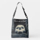 Crânio grande contra fundo preto ou escuro do lado da frente e crânio de ressonância do lado de trás. O texto "Olá, pessoal!" na frente e o texto Não me façam rir do lado de trás. Um dos dois lados, personalizáveis, imprimiu o saco. Você pode alterar ou excluir dois textos de modelo na frente e no verso. Sinta-se à vontade para usar o botão Personalizar para ajustar o produto às suas necessidades. Bom para uma festa de Halloween. Assustem todos.