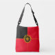 Crossbody Bag vermelho e preto preto na frente preto com o logotipo marrom e Y-NOT-ME dourado na frente, com linhas horizontais e verticais douradas atrás dele e com "GO AHEAD-VOCÊ PODE FAZER" na parte superior da frente também com "PORQUE NÃO ME É QUASE SEMPRE UMA PERGUNTA VÁLIDA" e o logotipo Y-NOT-ME no verso. Esta design é um encorajamento para todos, não tenham medo, façam o melhor que puderem. Tente aproveitar o que você faz, fique com ele.