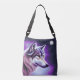 Esta é uma bela sacola de tote para um amante de lobo que apresenta uma ilustração de um perfil místico da face do lobo em branco e tons de roxo e azul.