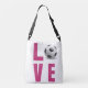 Love Soccer word design com letras faíscas cor-de-rosa quente e o "o" é substituído por uma bola de futebol.