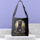 Saco preto de corpo cruzado com ilustração de um gato preto majestoso sentado em frente a uma órbita de ouro. O gato tem olhos amarelos intensos e expele um ar de mistério. Ao redor do gato está uma estrutura decorativa circular com designs e símbolos intrincados. A bolsa também tem um texto que diz "My Purr-fect Stuff" (Minhas coisas puras), acrescentando um toque divertido ao design geral.