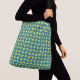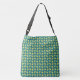 Senhoras Grande design de Crossbody em um padrão de triângulos amarelos com quadrados azuis dispostos aleatoriamente contra uma cor base verde.