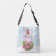 Saco de tote com um design bonitinho e caprichoso com um pinguim adorável vestindo um chapéu de santa vermelho. Ficando atrás de um buquê de flores com canas doces listradas cor-de-rosa e branca. Um fundo de inverno nevado com flocos de neve e árvores.