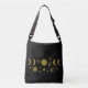 Este design apresenta uma mistura harmoniosa de motivos celestes e botânicos renderizados em folha de ouro brilhante contra um fundo preto profundo. No centro, há uma lua cheia radiante, ladeada simetricamente por fases da lua crescente que evocam o ritmo dos ciclos lunares. Ao redor desses elementos celestes, há floreios delicados: ramalhetes frondosos, uma flor estilizada, um coração e um ponto único — cada um contribuindo para o senso de equilíbrio e elegância orgânica. A composição é visualmente centralizada e espaçada de forma pensada, criando uma sensação de calma e conexão cósmica. A textura da folha de ouro adiciona profundidade e luxo.