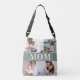 Cute I Love You Mãe Dia de as mães Photo Crossbody Bag apresenta quatro das suas fotos favoritas com o texto "Eu te amo Mãe" na tipografia branca moderna. Elaborado por ©Evco Studio www.zazzle.com/store/evcostudio