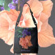 Esta bolsa de corpo cruzado flagrante mostra uma flor de Hibiscus laranja-rico com flores roxas e folhas verdes. Esta flor tropical vibrante aparece neste saco preto dramático. Sinta os trópicos neste floral brilhante e colorido e personalize facilmente com seu nome. Esta é a fotografia botânica original de JLW_PHOTOGRAPHY