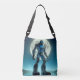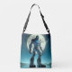 O Sasquatch está debaixo de uma lua de cheio rodeada por montanhas, revelando um exoesqueleto de titânio de circuitos eletrônicos e luzes LED...