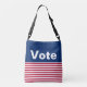 Esta bolsa de corpo cruzado tem um campo azul no topo com a palavra "voto" em letras brancas. Tem listras vermelhas e brancas no fundo que lembra a bandeira americana. Você pode alterar o texto se desejar.
