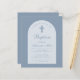 Um convite para o batismo moderno. Em um fundo azul empoeirado, ele tem um arco branco com dentro de texto azul empoeirado. A palavra Batismo e o nome são escritos num guião caligráfico elegante; a primeira linha é o texto arquivado.